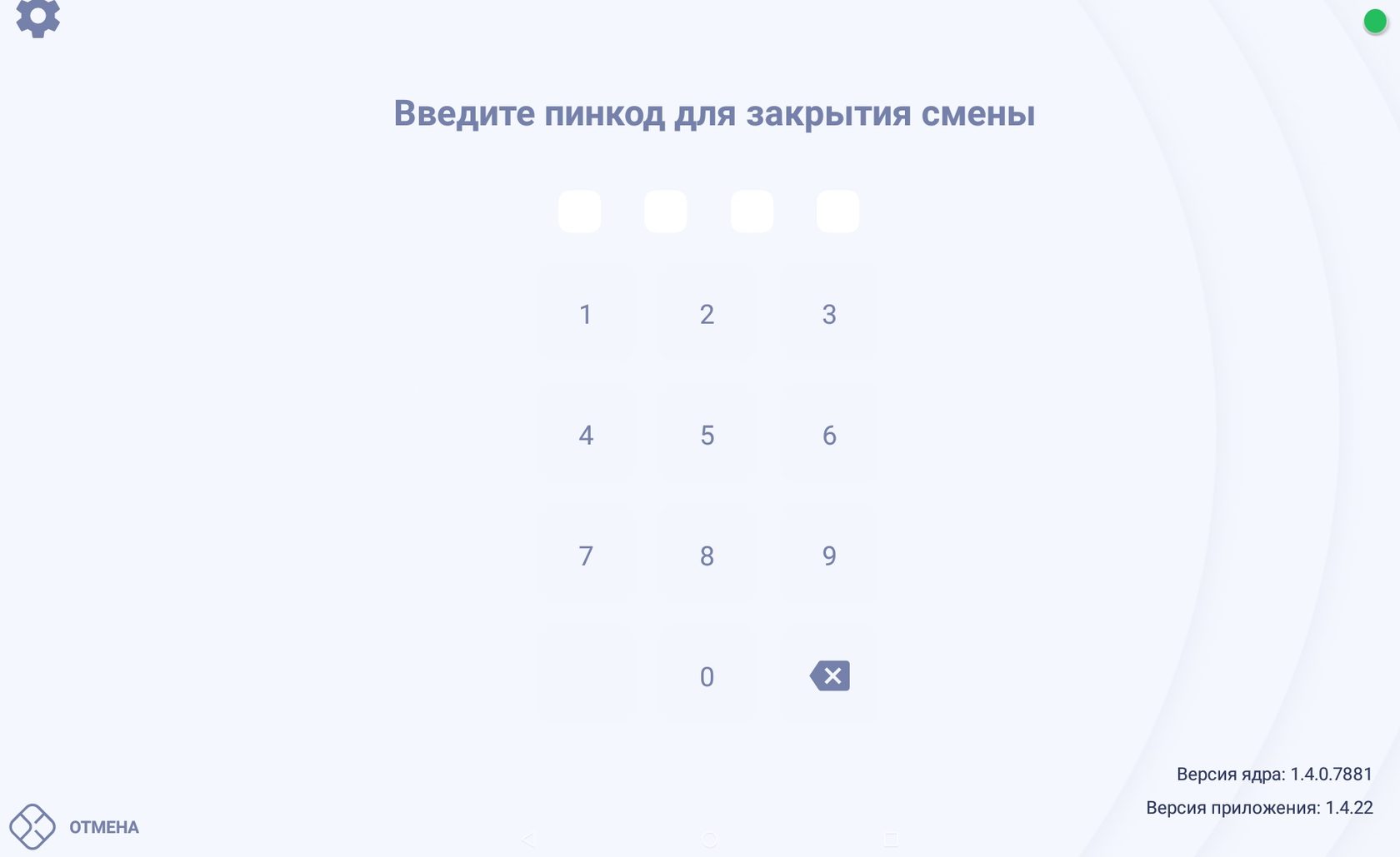Если нужно выйти из режима закрытия смены нажмите на кнопку "Отмена" в левом нижнем углу.