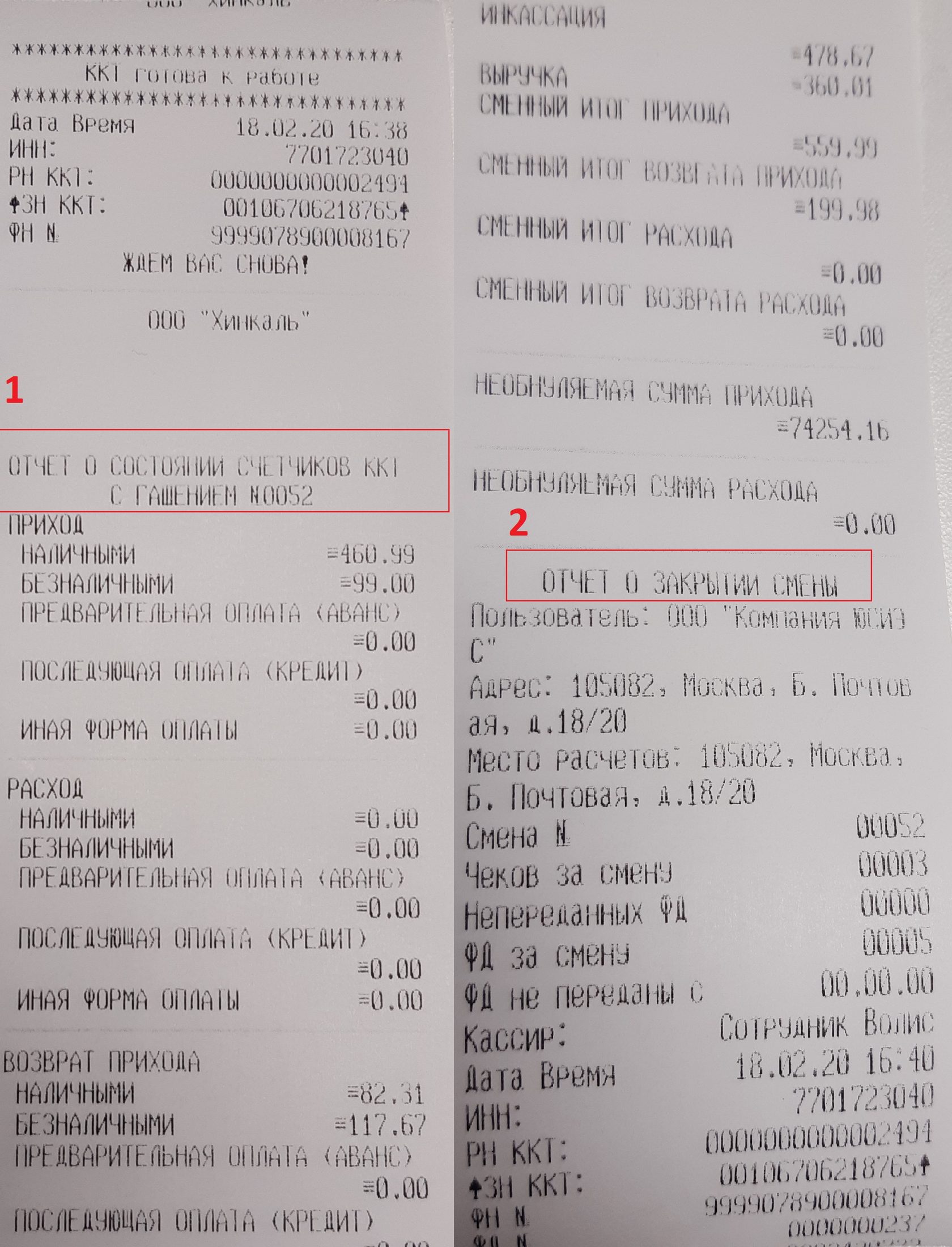 Пример отчетов, полученных на терминале при закрытии кассового дня: