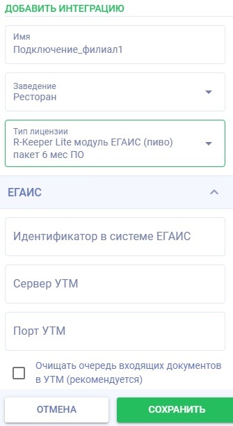 Тип лицензии – тип интеграционной лицензии для системы ЕГАИС (на 1, 6 или 12 месяцев).