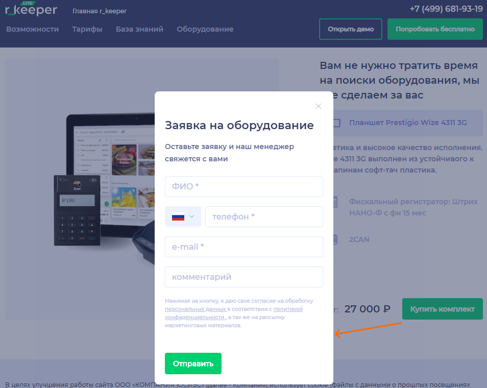 r_keeper Lite в разделе "Оборудование" представлен вариант готового комплекта с указанием состава и стоимости, который можно заказать, заполнив форму для обратной связи по кнопке "Купить комплект".