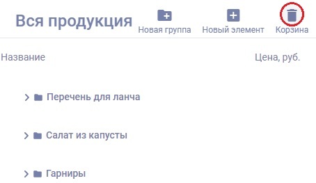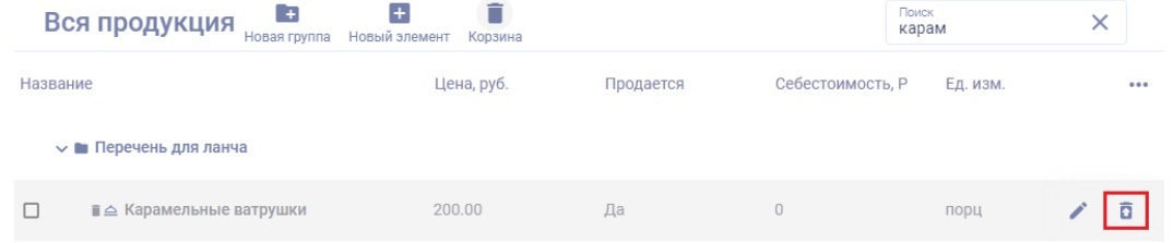 1. Нажмите на кнопку корзины на панели инструментов справочника "Вся продукция".