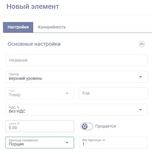 Значение поля является коэффициентом пересчета одной единицы измерения создаваемого элемента в килограмм. Например, одно куриное яйцо (в шт.) весит 0,040 (в кг). Задание этого параметра необходимо для корректного формирования технологических карт и для расчета калорийности блюда.