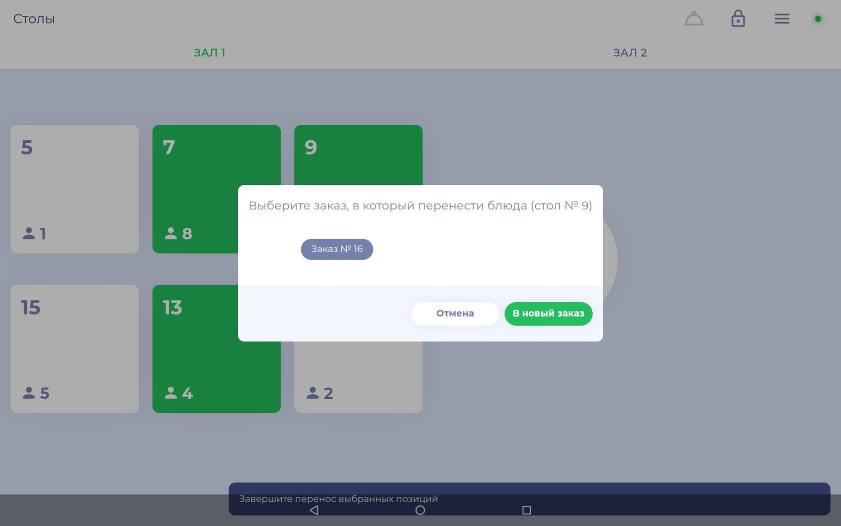 2. Выберите номер стола и укажите номер заказа, к которому будет добавлено переносимое блюдо, или создайте новый заказ для этого же стола по кнопке "В новый заказ".