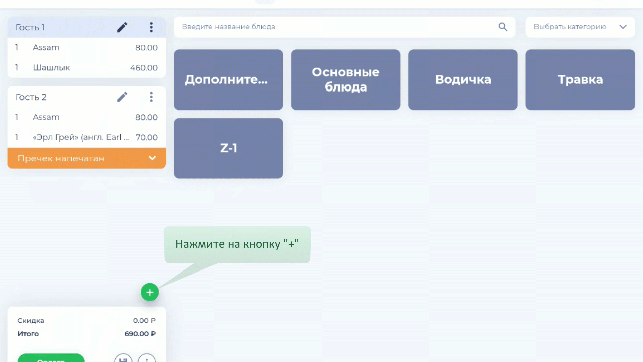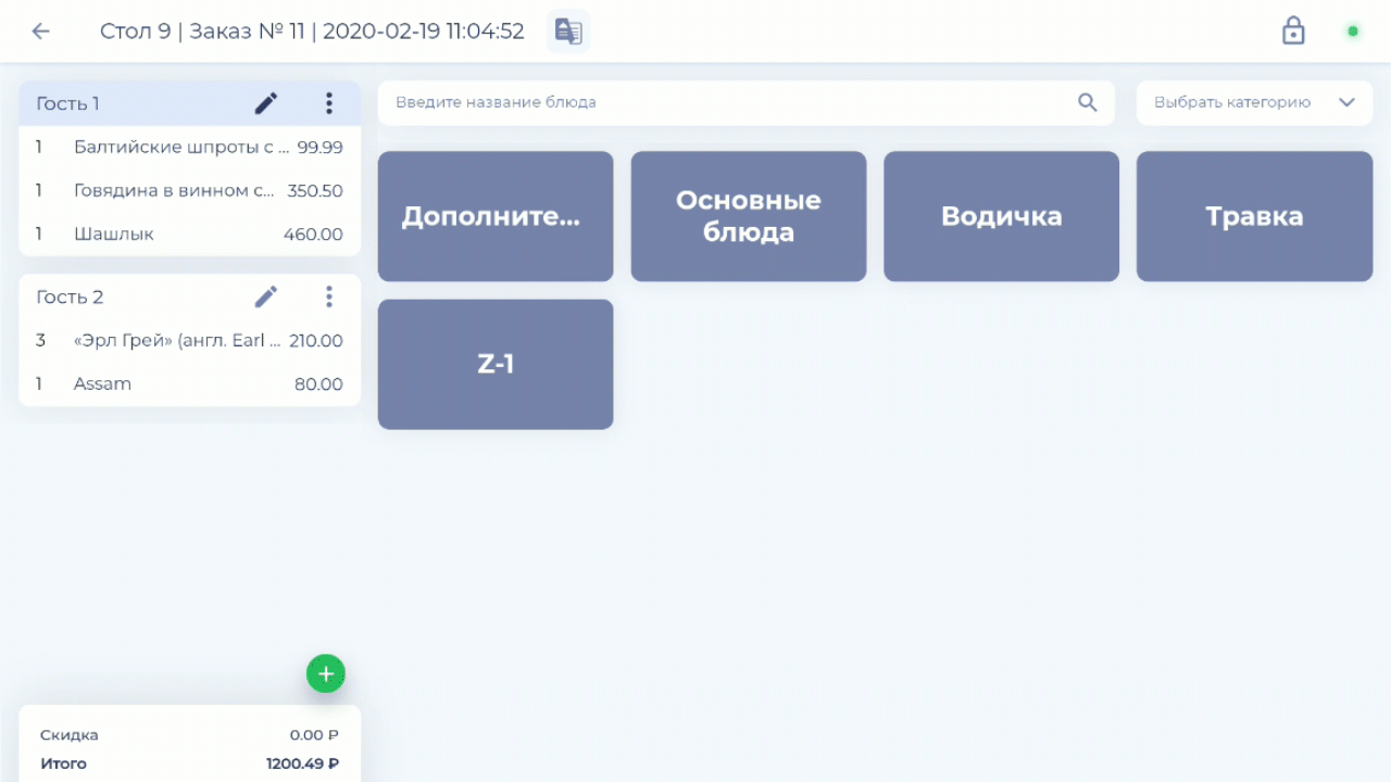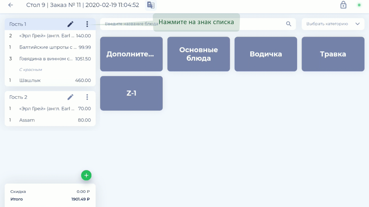 Откроется заново окно "Заказ" с имеющимися гостями и закрепленными за ними блюдами.