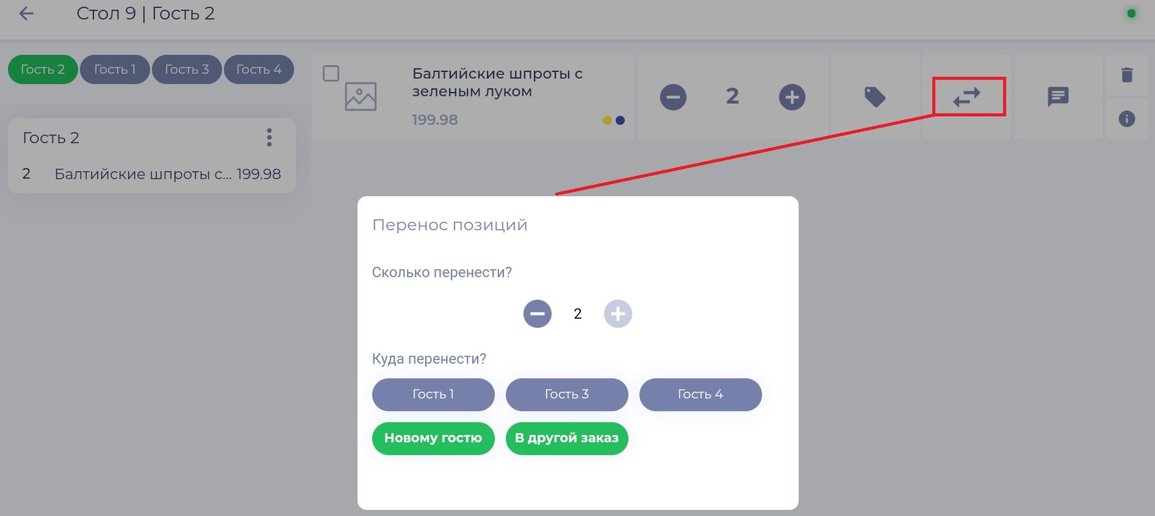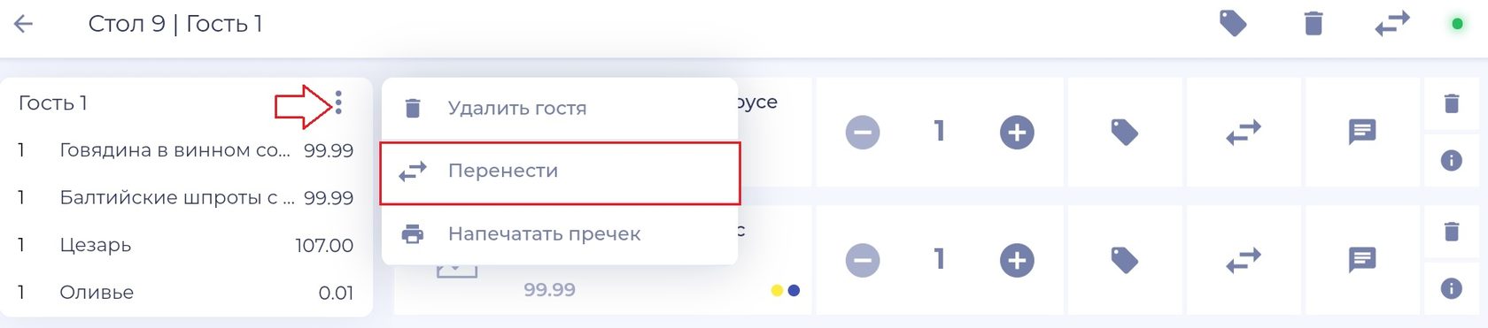 После завершения переноса блюдо отобразится в указанном заказе и для выбранного гостя.