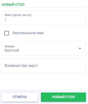 Количество мест – обязательное поле, имеет удобный встроенный счетчик для увеличения/уменьшения количества посадочных мест, значение отображается на блоке с названием стола (эта информация нужна для официанта, чтобы он мог определить, сколько людей можно разместить за этим столом. Минимальное количество равно 1, максимально допустимое - 300 человек).