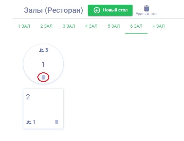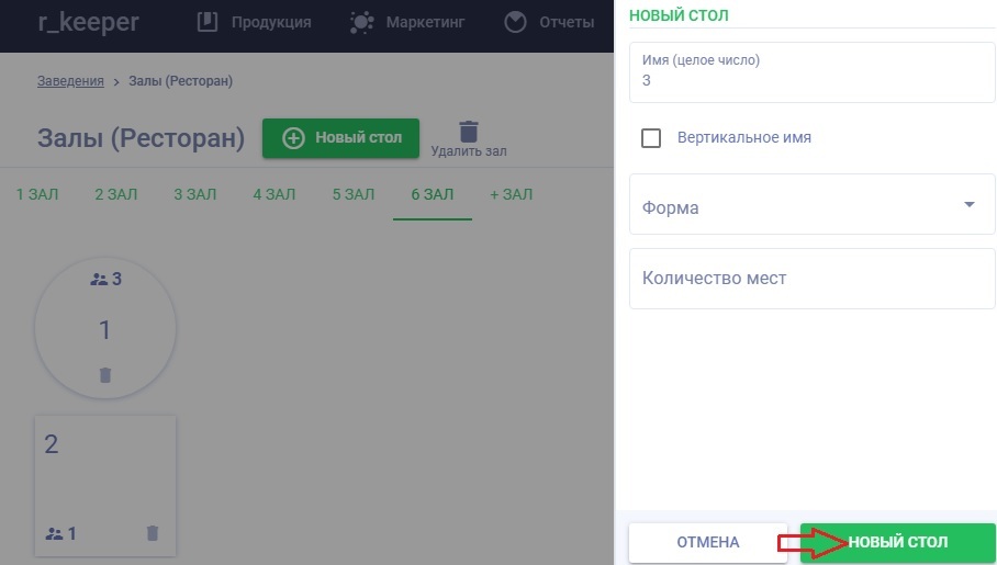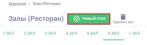 1. Чтобы создать в этом зале столы, нажмите на кнопку "+ Новый стол".