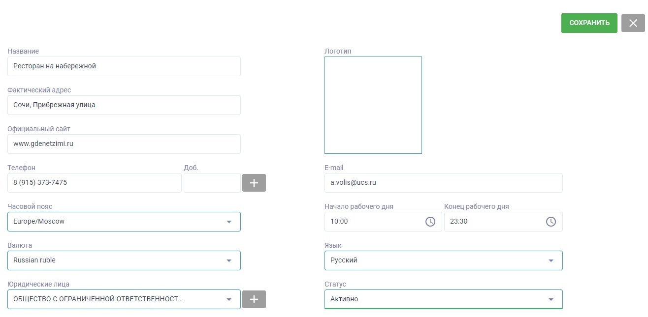 4. После заполнения (редактирования) нужных полей нажмите на кнопку "Сохранить" в правом верхнем углу карточки заведения.