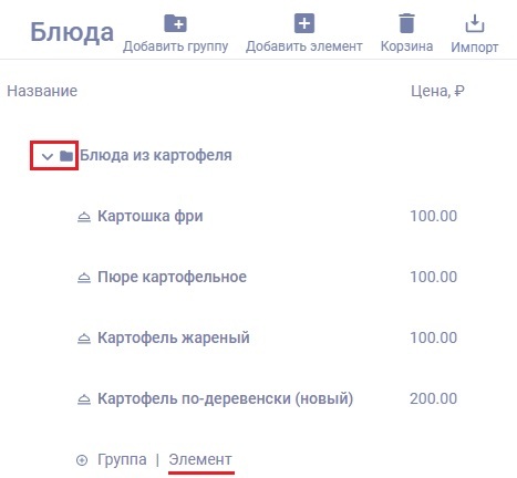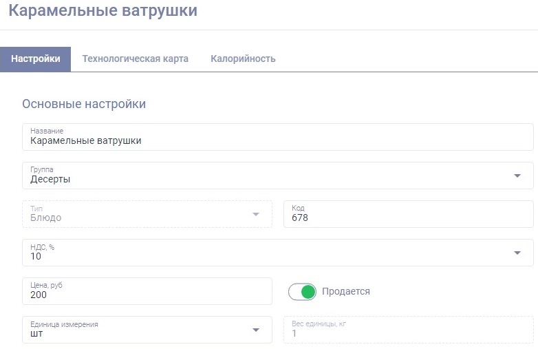 Цена, руб - если блюдо продается, то в этом поле необходимо задать его цену.