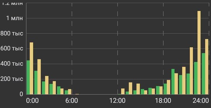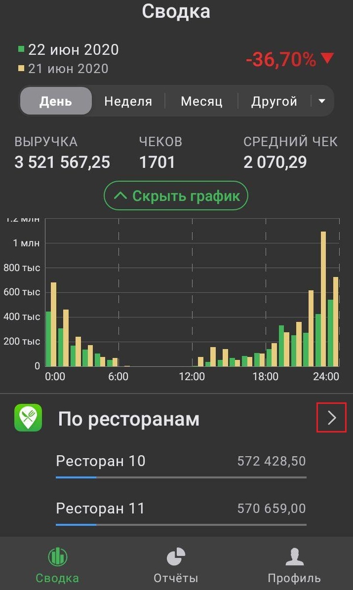 На графике экрана "Сводка" отображается почасовая сводная выручка ресторанов. При этом зеленым цветом отмечена выручка за текущий период, а желтым - за прошлый.