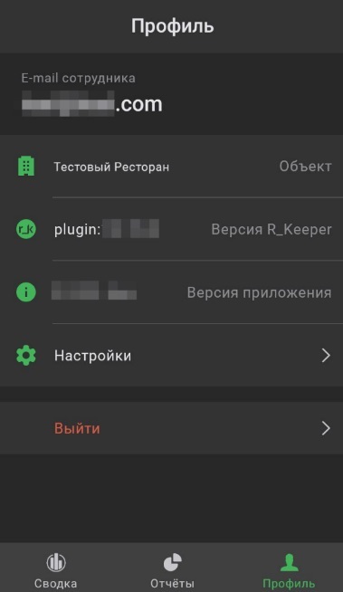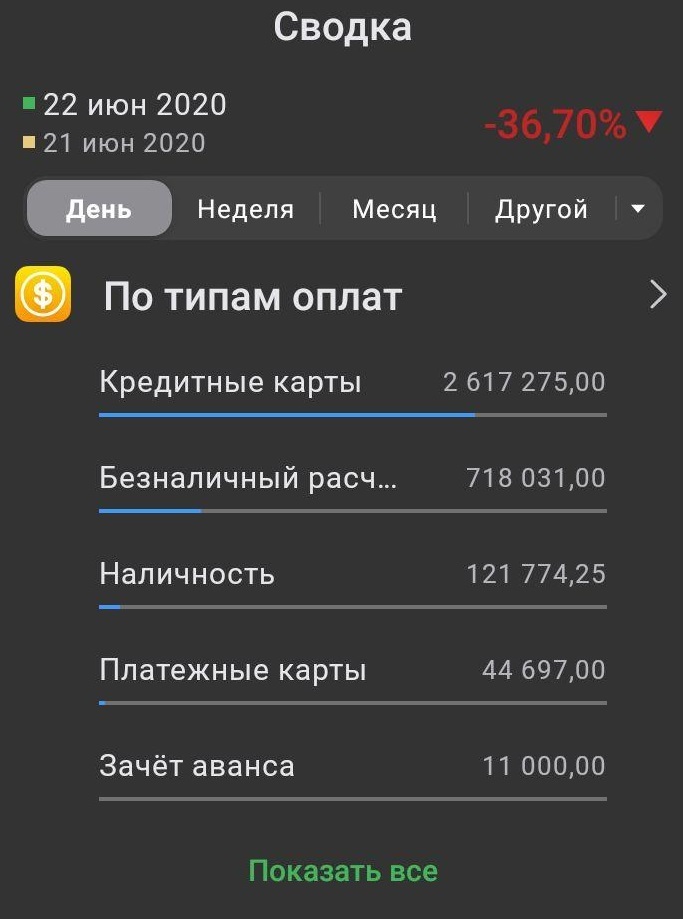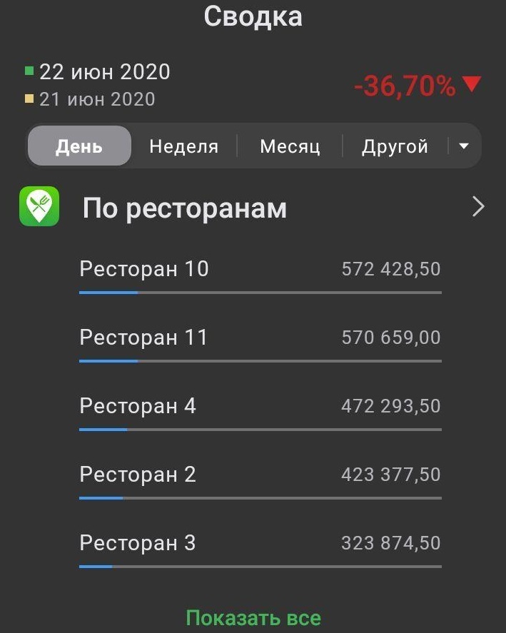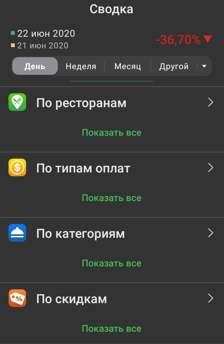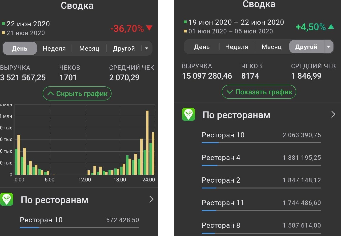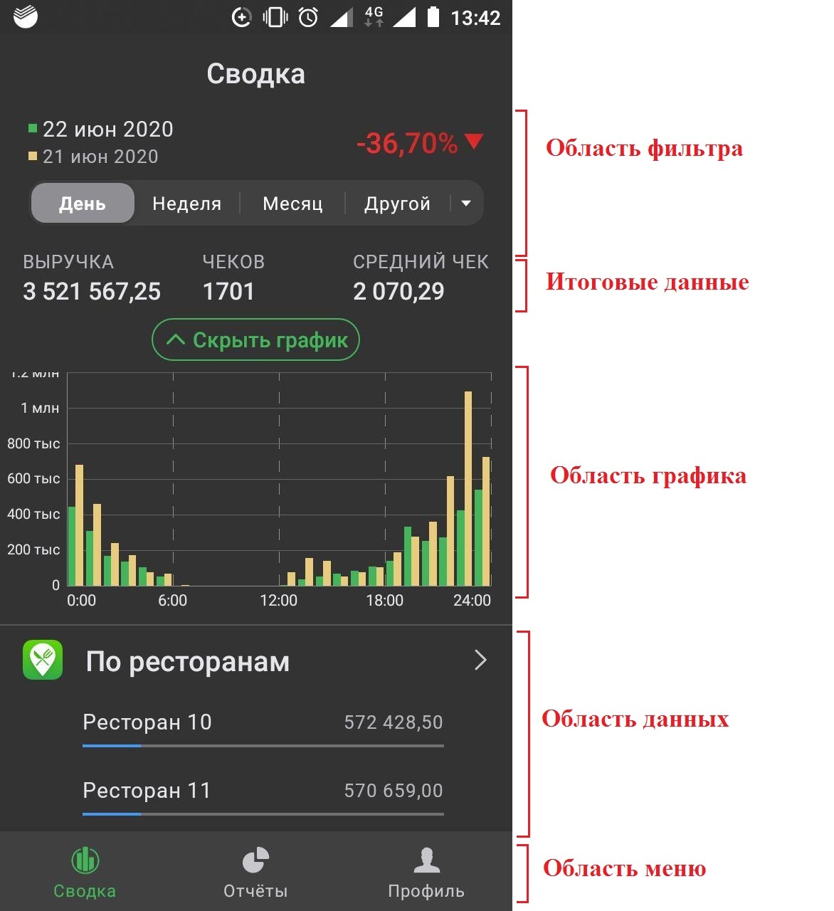 Главным экраном приложения является экран "Сводка". На нем можно посмотреть сравнительные данные по выручке за выбранный период в числовом и графическом виде, а также итоговые данные по выручке, количеству чеков и среднему чеку и величину выручки с группировкой по ресторанам, типам оплат, категориям и скидкам.