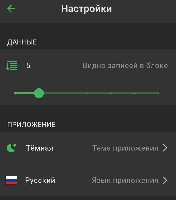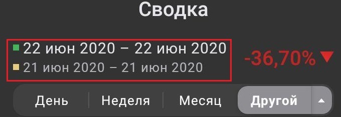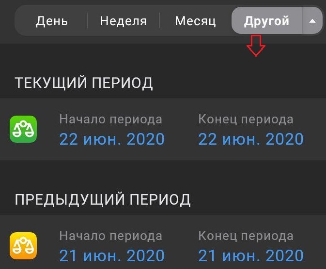 Выбранное значение отображается в области фильтра. При этом на экране "Сводка" показывается как текущий период (имеет зеленый индикатор), так и прошлый (имеет желтый индикатор). На остальных экранах приложения отображается только текущий период.