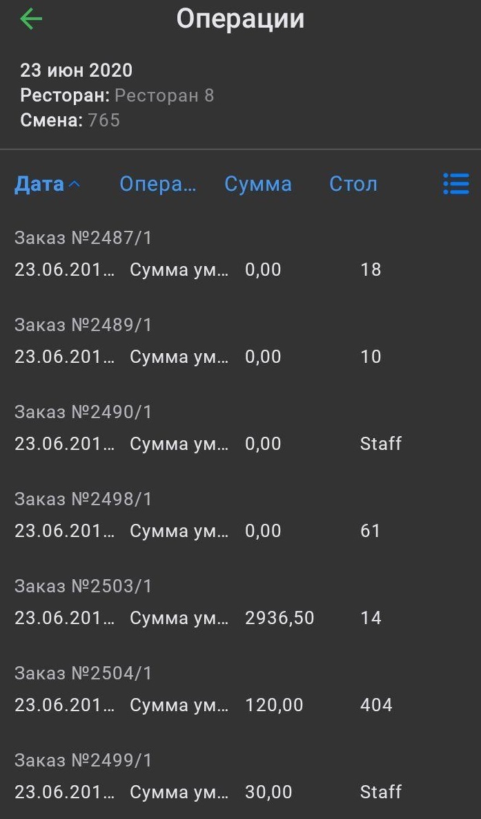 Данный отчет строится только для выбранного ресторана и с указанием смены. В отчете "Операции" отображаются следующие данные: