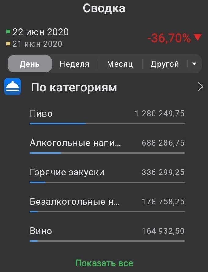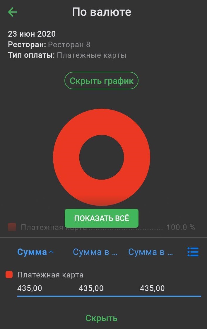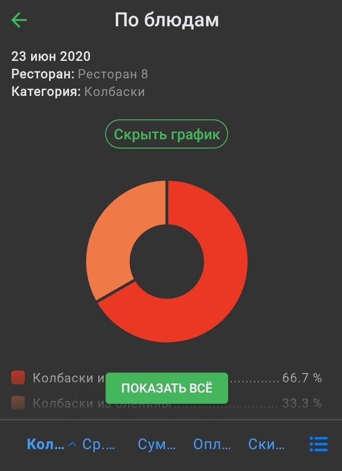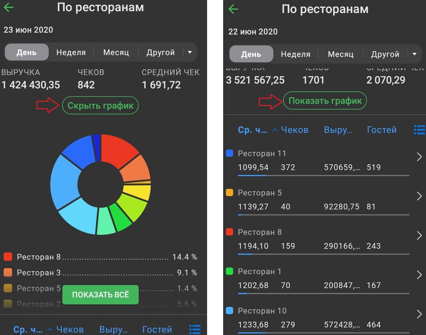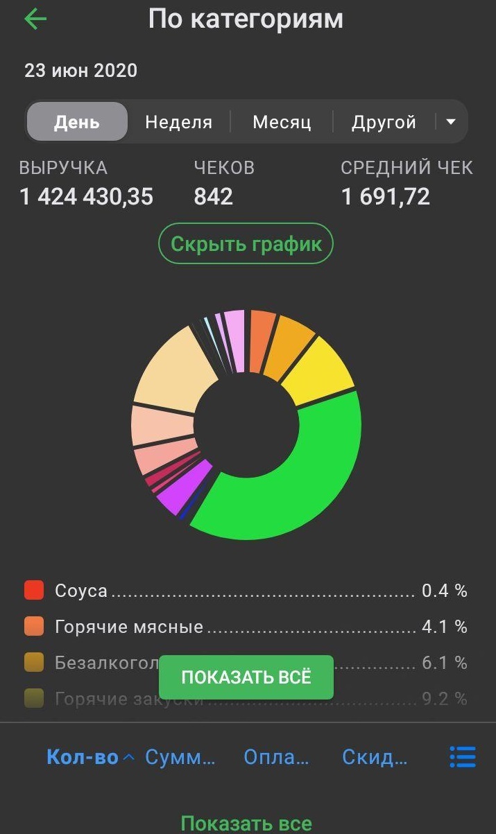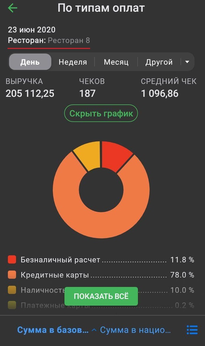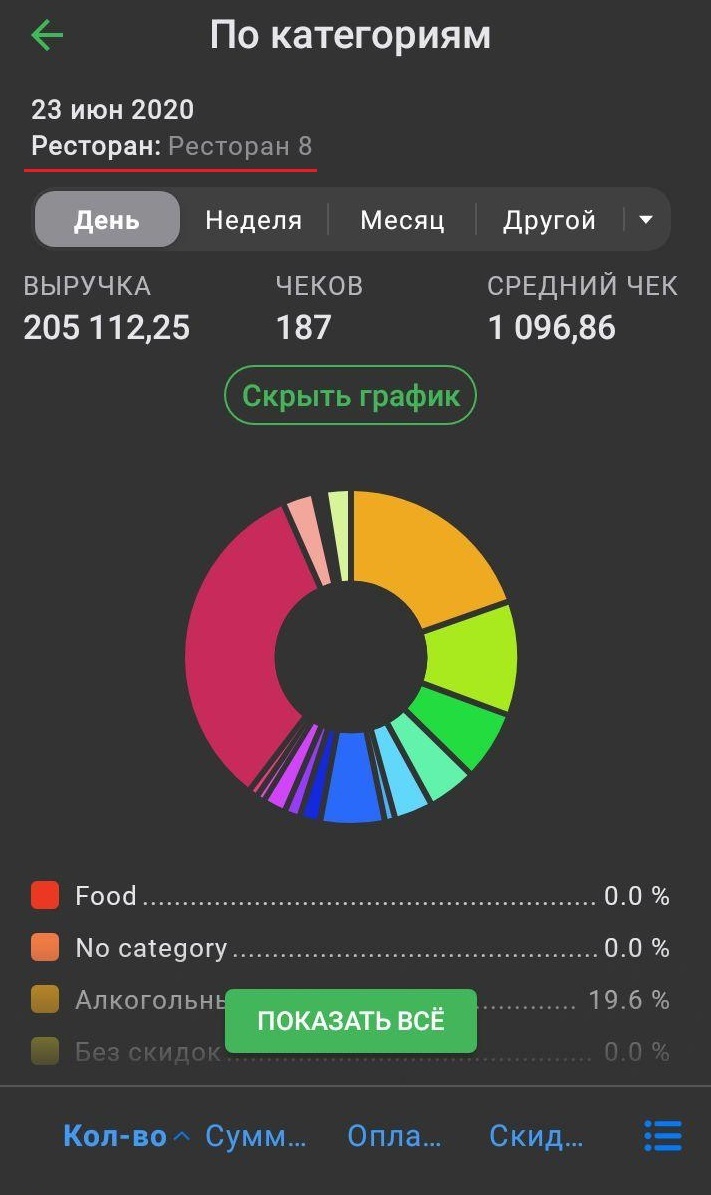 А также перестроится график, и обновятся итоговые данные и отчетов "По ресторанам", "По категориям", "По скидкам" и "По типам оплат" экрана "Сводка".