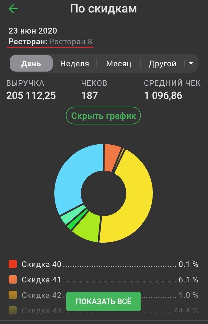 Если отчет "По скидкам" был сформирован для определенного ресторана, то любая скидка