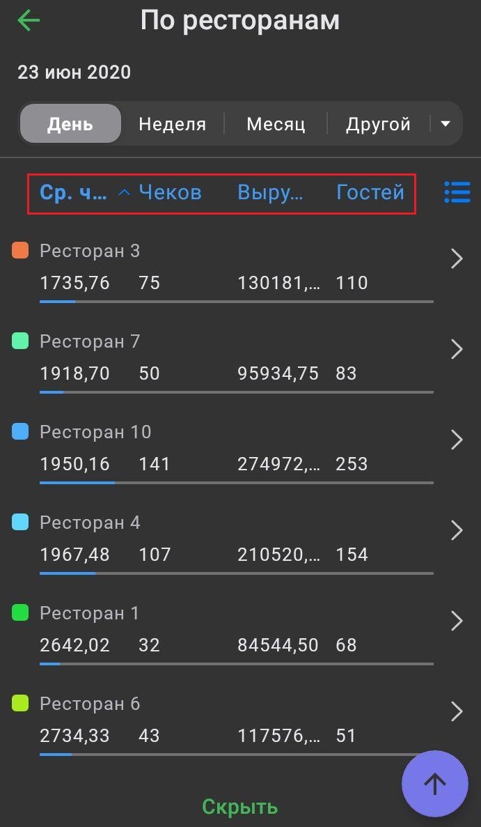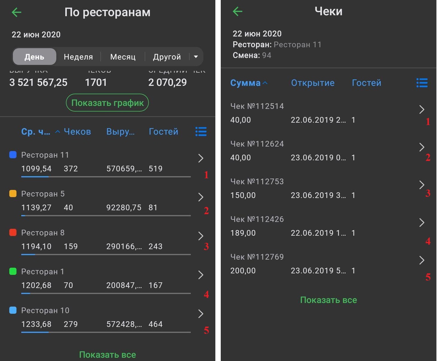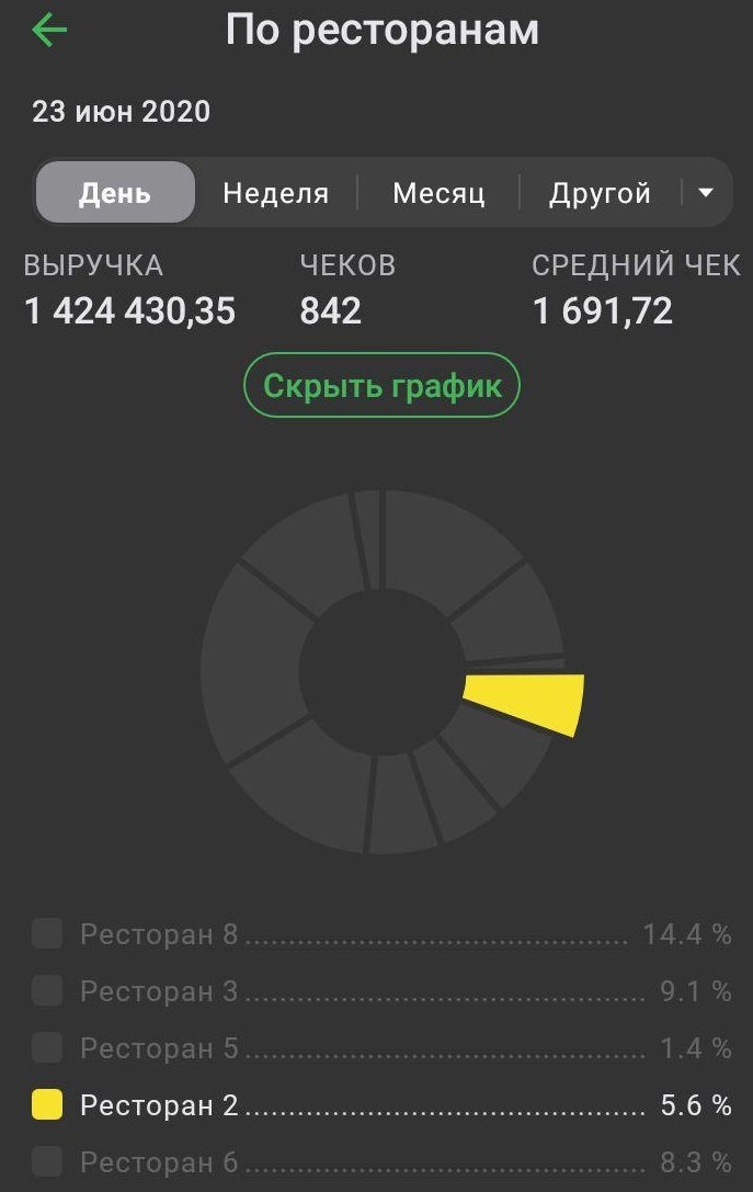 В этом случае величины "сумма выручки", "количество чеков" и "величина среднего чека" отображаются для указанного ресторана.