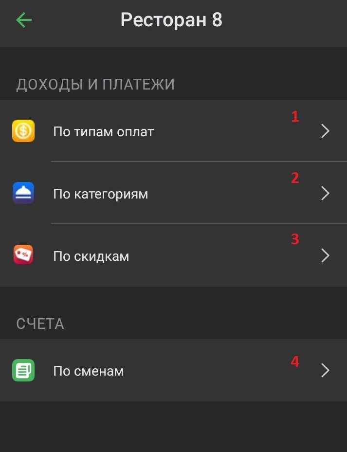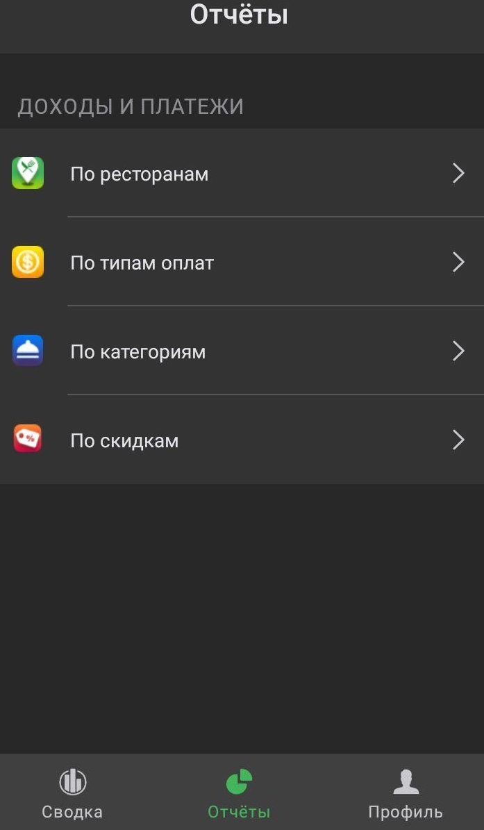 Переход на экран "Отчеты" осуществляется из области меню. С этого экрана Вы можете перейти на детализацию отчетов "По ресторанам", "По типам оплат", "По категориям" и Отчет "По скидкам".