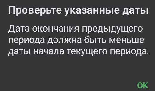 Дата окончания предыдущего периода не должна превышать дату начала текущего периода. Если это условие не выполнено, то при нажатии на кнопку "Сравнить периоды" на экране отобразится сообщение об ошибке: