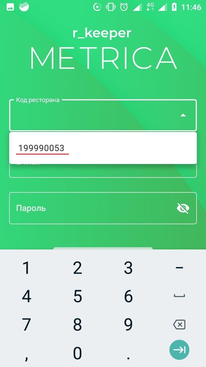 Значение "Кода ресторана" не может превышать 50 символов. Приложение запоминает 10 последних кодов ресторанов, под которыми была осуществлена авторизация, и предоставляет их на выбор при вводе данных в поле "Код ресторана".