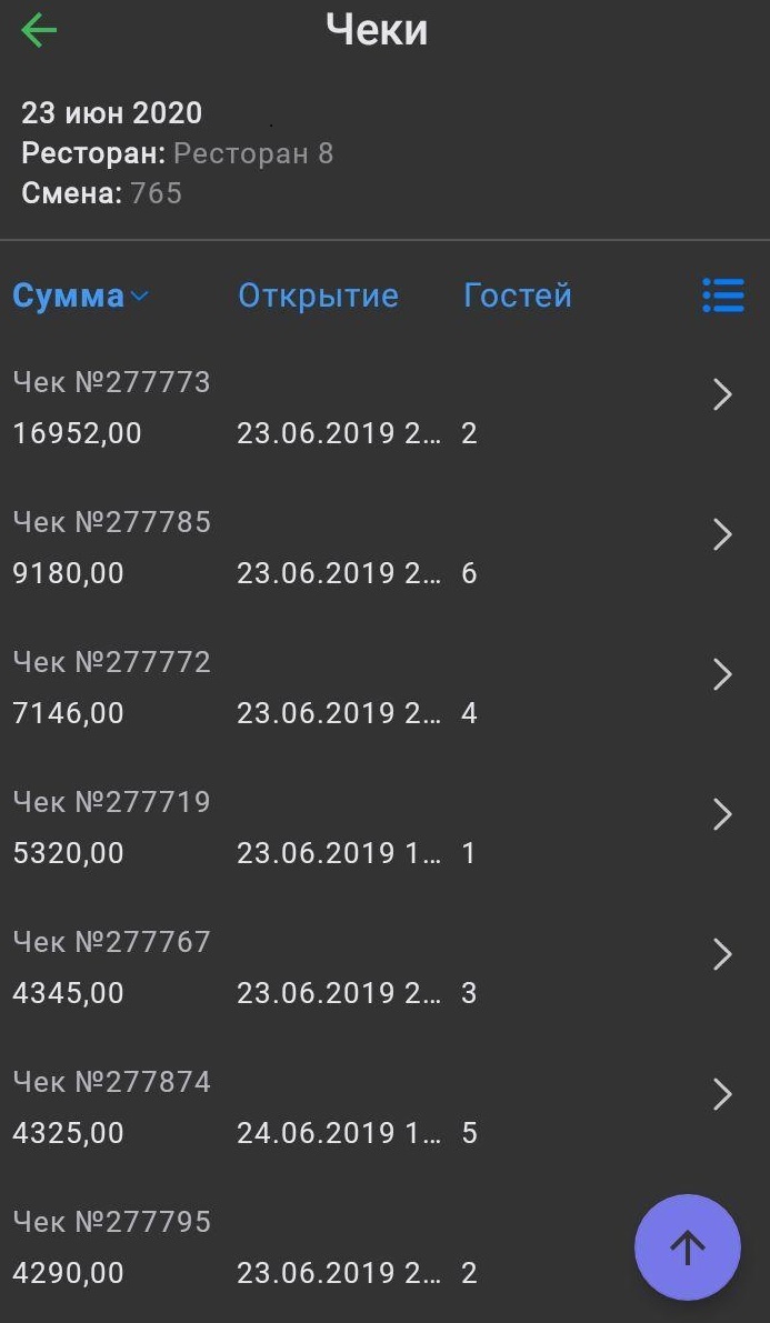 Данный отчет строится только для выбранного ресторана и с указанием смены. В отчете "Чеки" отображаются следующие данные: