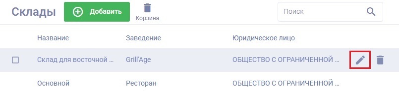 2. Найдите удаленный склад и нажмите на кнопку "Восстановить":