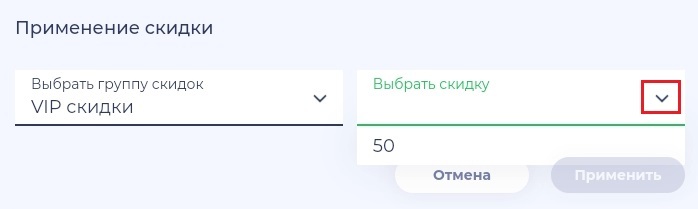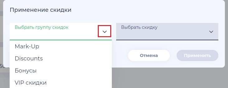 3. Выберите нужную группу скидок/наценок и конкретное значение из имеющегося списка (см. подробнее "