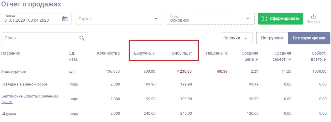 Прибыль, полученная от продажи конкретного товара или блюда, наглядно представлена в "Отчете о продажах".