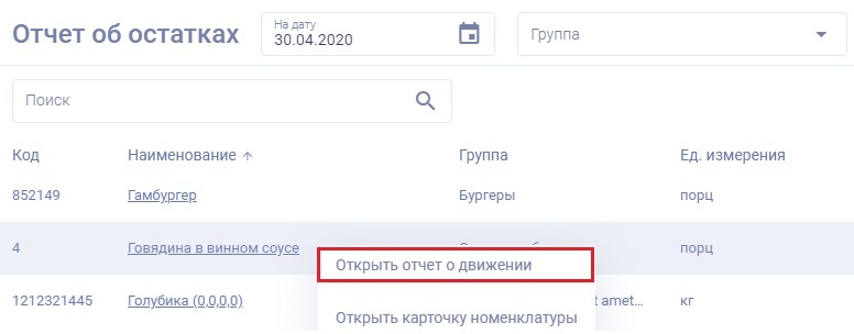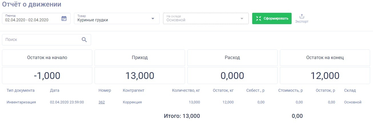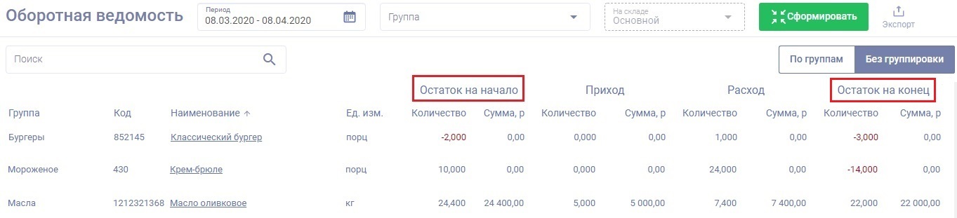 Отчете об остатках".