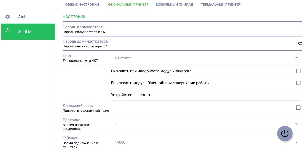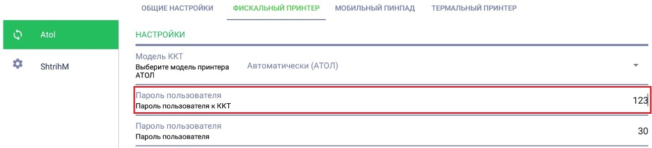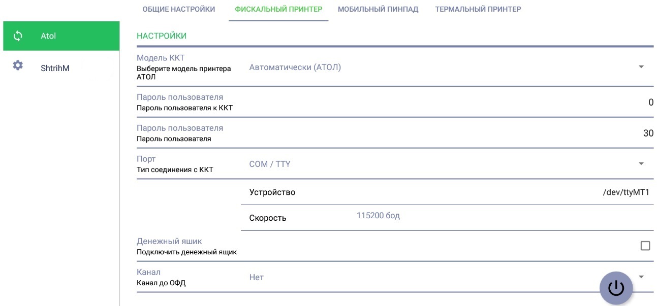 2. Перейдите на вкладку "Фискальный принтер". По умолчанию будут открыты настройки для принтера Atol. Описание параметров принтера Shtrih M приведено