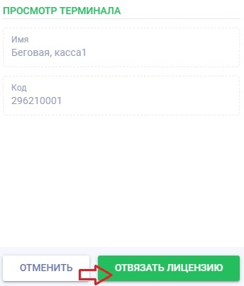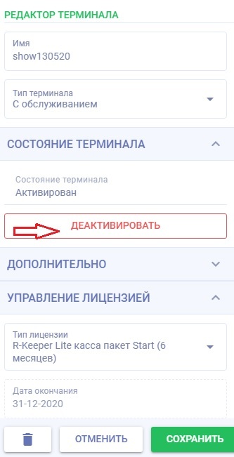 Если терминал находится в статусе "Удален", то к нему можно привязать оплаченную лицензию, но его нельзя будет активировать (так как будет недоступна кнопка "Код активации". Для этого терминал нужно перевести в статус "Активный").