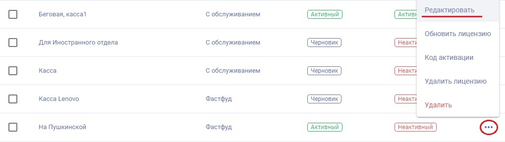 Активный – статус действующего терминала (по умолчанию сохраняется в этом статусе, если у заведения есть оплаченная мастер-лицензия и если есть свободная кассовая лицензия, которая привязывается автоматически).