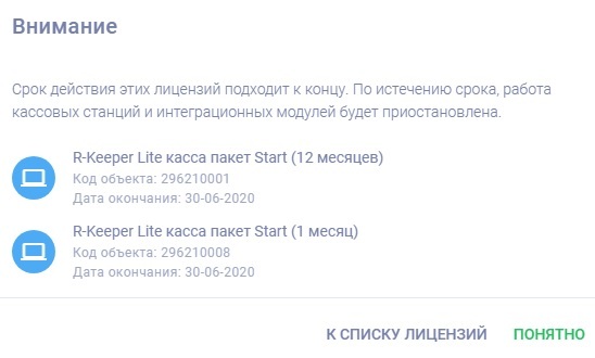 Если тип лицензии при продлении тот же, и есть свободные кассовые лицензии, то после истечения срока текущей лицензии терминал автоматически переключится на новую, которая предварительно была заказана и оплачена (см. подробнее раздел "